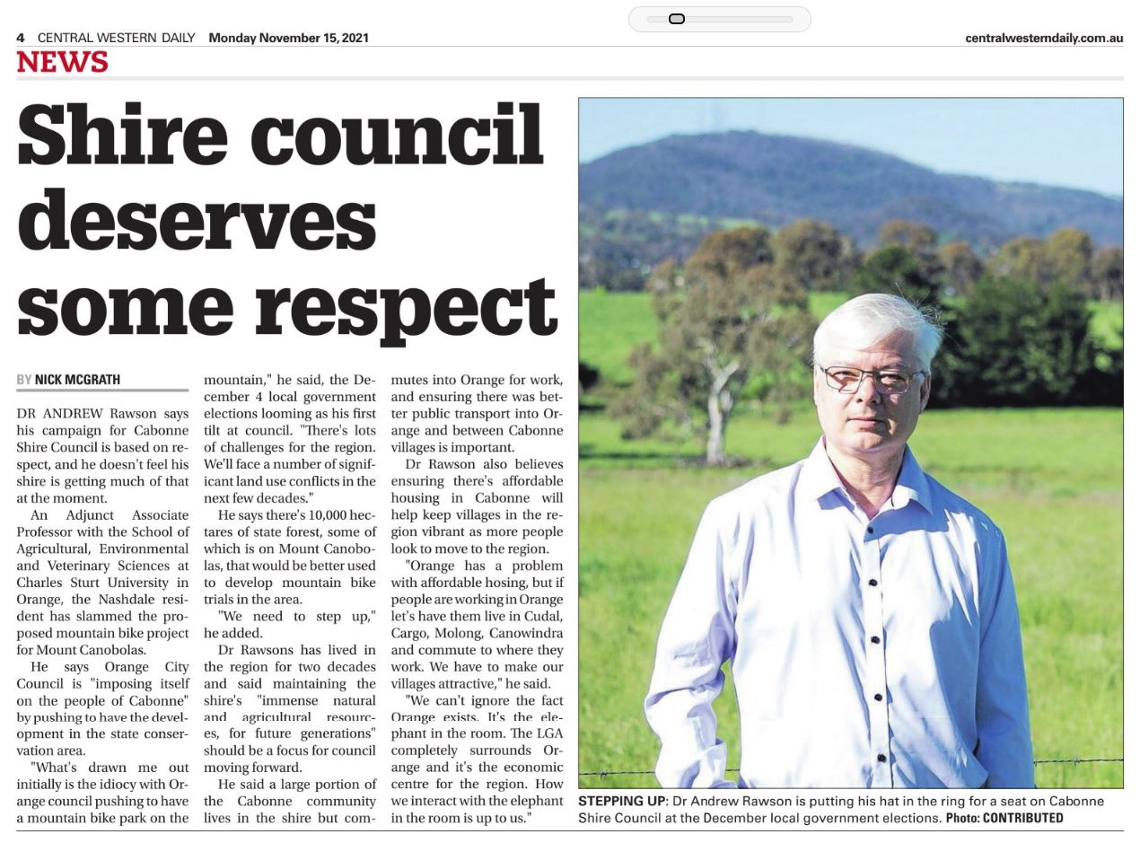 Shire Council deserves some respect Posted byrawson4cabonne15th Nov 202115th Nov 2021Posted inMedia Release, News Cabonne Shire Council candidate Dr Andrew Rawson touches on affordable housing in Orange and Mount Canobolas Read the article Share this: Share on X (Opens in new window) X Share on Facebook (Opens in new window) Facebook Like Loading... Related